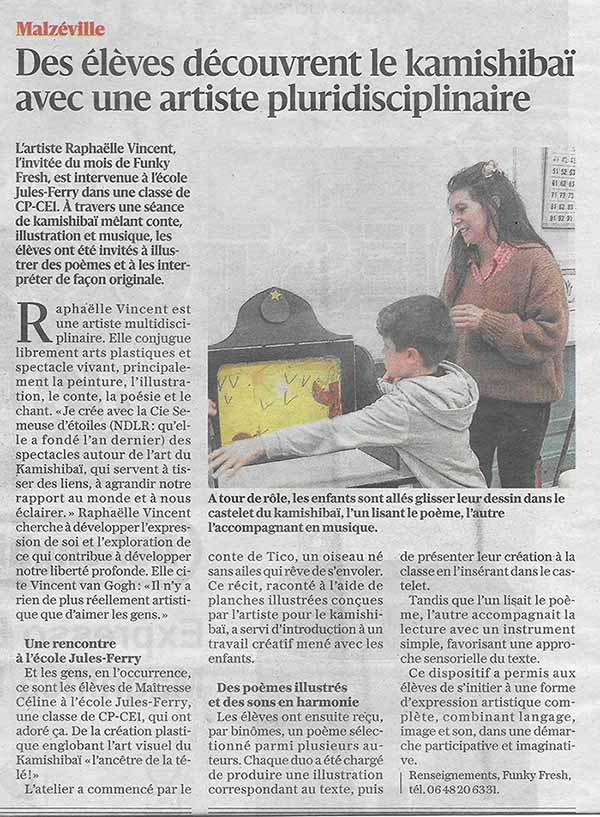 Depuis 2021, l’association FUNKY FRESH propose des expositions mensuelles dans les espaces de vie sur le territoire de Malzéville et Saint-Max, touchant un public de 7 à 77 ans. De septembre à juin un artiste différent expose simultanément dans tous les espaces mis à disposition de l’association. La rencontre entre les artistes étant au coeur du projet, chaque mois l’artiste invité propose un atelier découverte de sa démarche et de sa pratique artistique dans les structures accueillant du public.